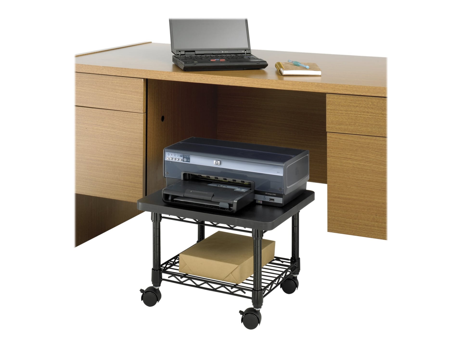 The laminate top boasts a weight. Safco® scoot™ deskside printer stand. The black and silver printer stand has a unique hole pattern design with silver leg accents and black powder coat with laminate top for durability. An easy solution to all your business storage needs, the safco desk side wire machine stand features a spacious top and two open shelves. This is the perfect size for bigger printers.